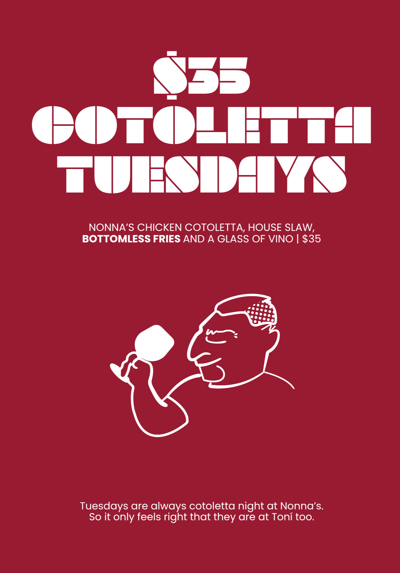 TUESDAYS ARE ALWAYS COTOLETTA NIGHT AT NONNA’S. SO IT ONLY FEELS RIGHT THAT THEY ARE AT TONÍ TOO.